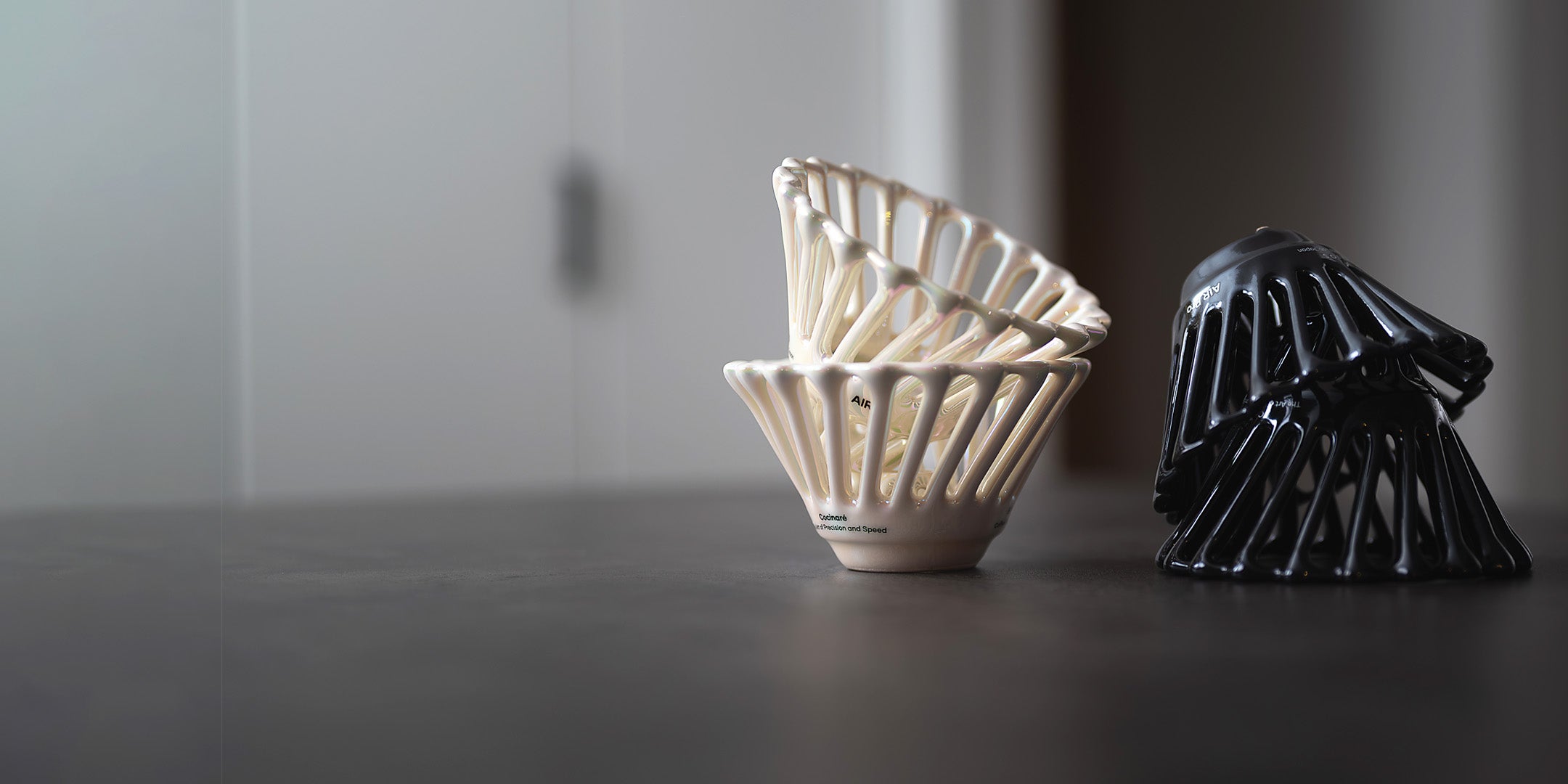 The new "AIR Series" coffee dripper lineup includes two models: the standard model "AIR," with a two-layer lattice design in a straight cone shape, and the "AIR Pro," with a unique concave design in which the second layer is folded inward.
