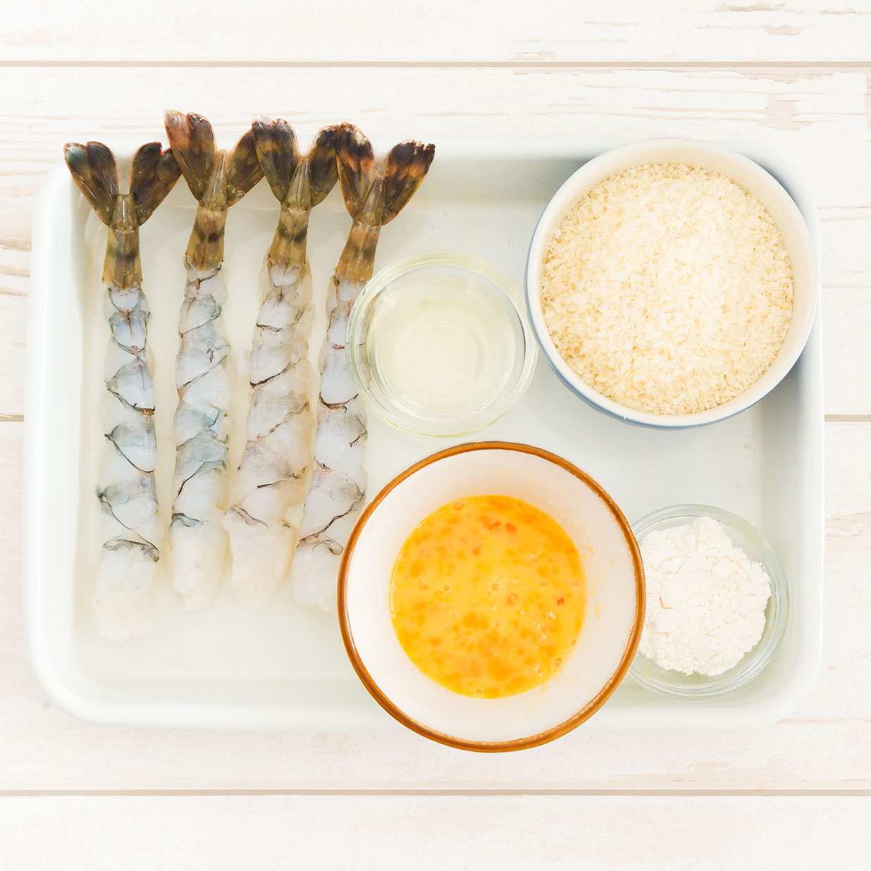 えびフライ用ののばしエビを購入すれば、1の工程は省くことができることで時短につながります。