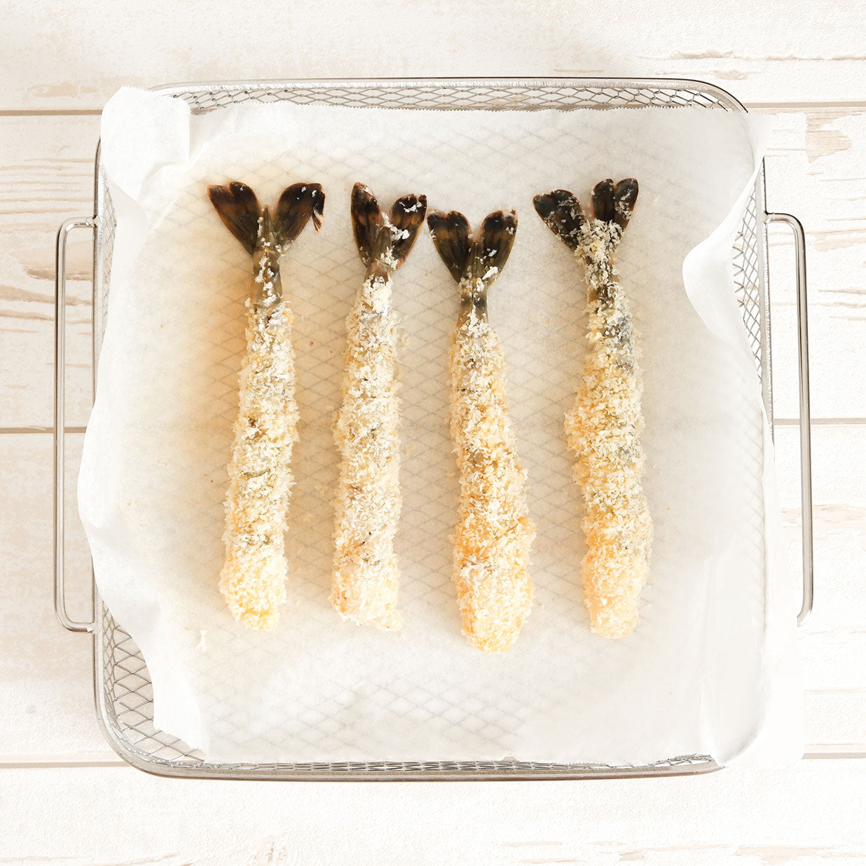焼き時間はえびのサイズによっても異なります。先にパン粉が焦げてしまう場合は、上にアルミホイルをかぶせて中まで火を通してください。