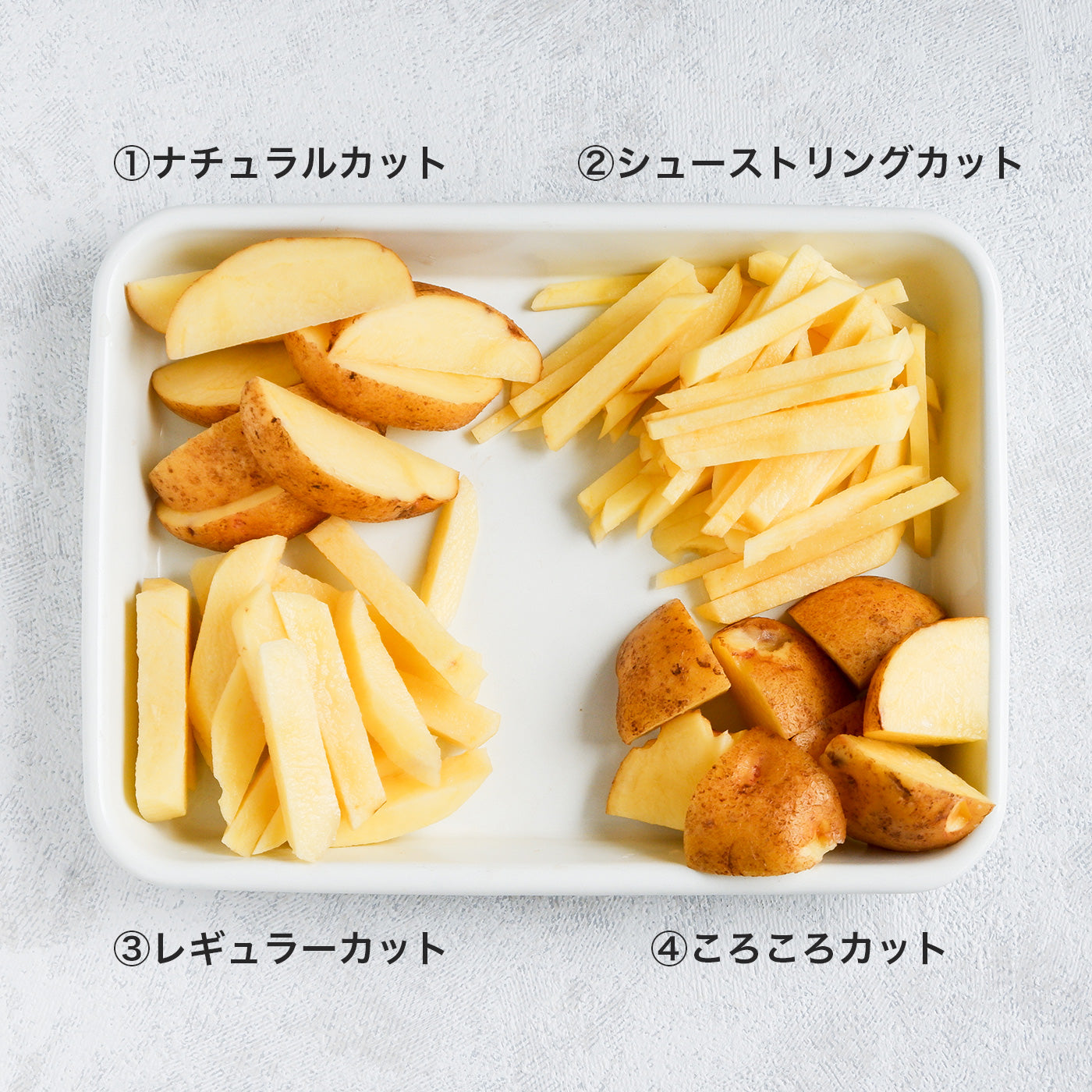 カットする大きさの違いで、まるでお店で食べるフライドポテトのような仕上がりになります。どのカットがどのお店の食感に近いかを楽しんでみてください。