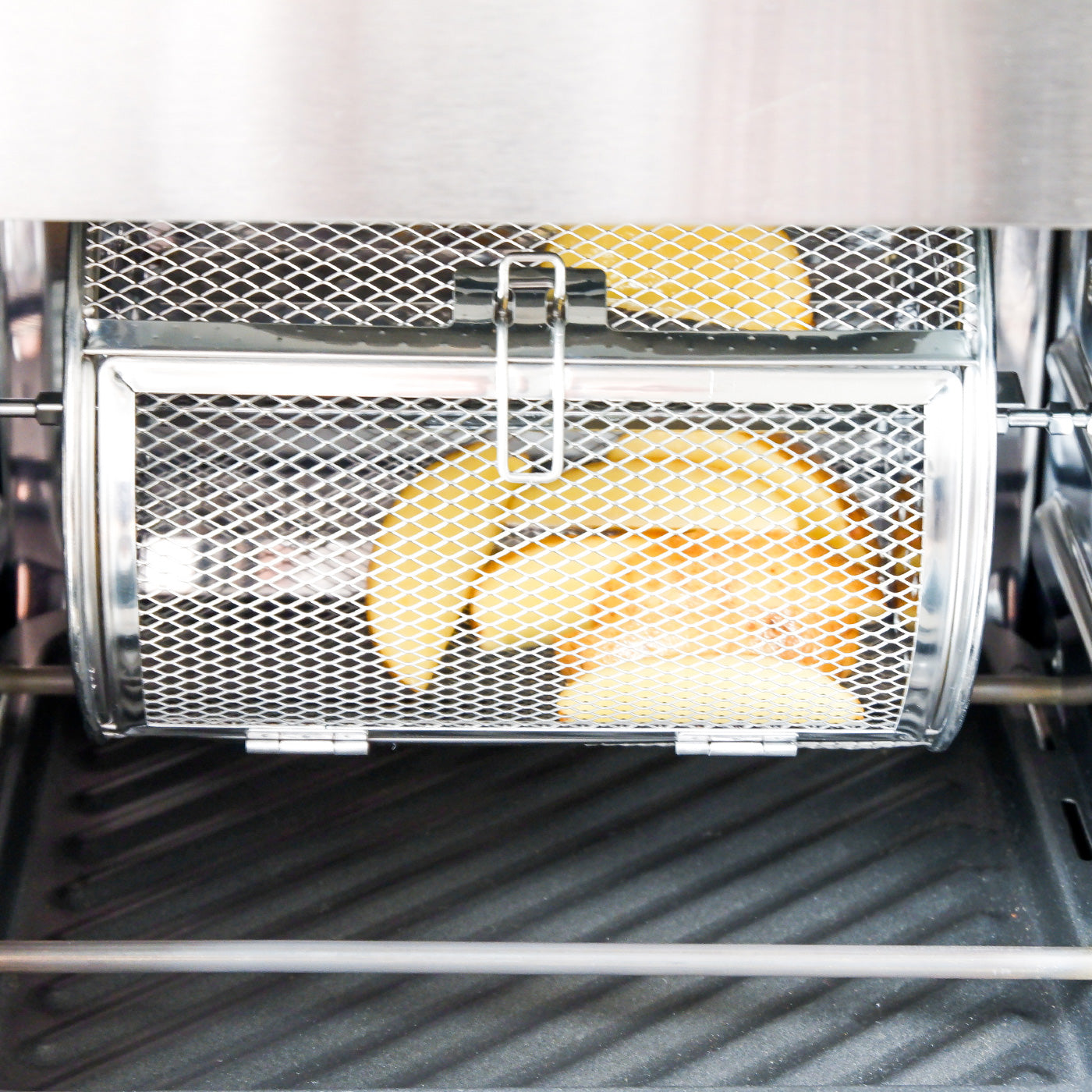 オーブンでフライドポテトを作ると、上はカリッとできても、天板と接している下の部分はしんなりしてしまいます。Chefに付属している回転バスケットを使えば、ぐるぐる回転しながらまんべんなく加熱してくれるので、加熱ムラがなく、どこを食べてもカリッとおいしく仕上がります。