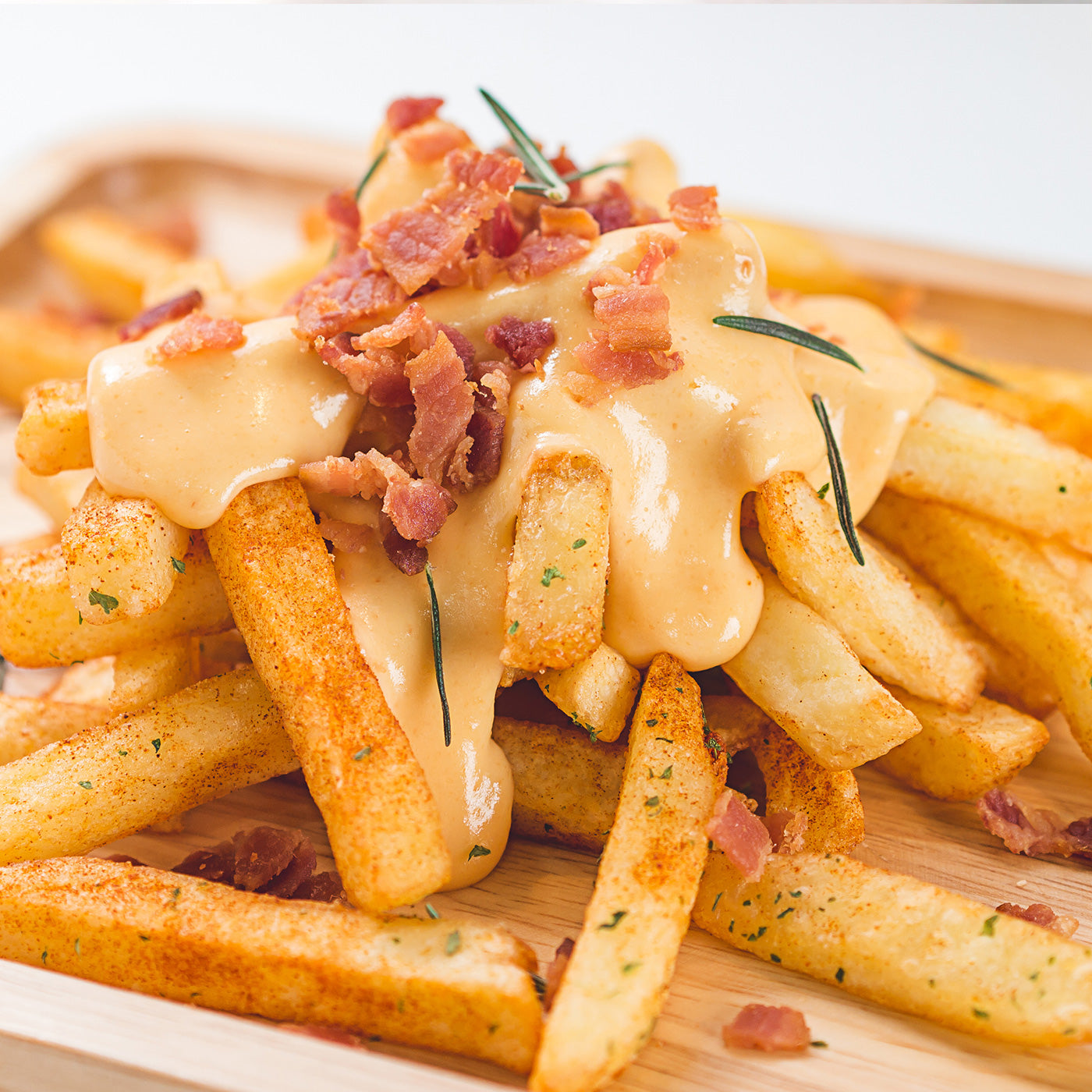 玉ねぎ、ベーコンをお好みのサイズにカット、ハラペーニョ、スイートチリソース、チーズ、モッツァレラチーズを180℃/5分加熱。ポテトにかけて出来上がり!