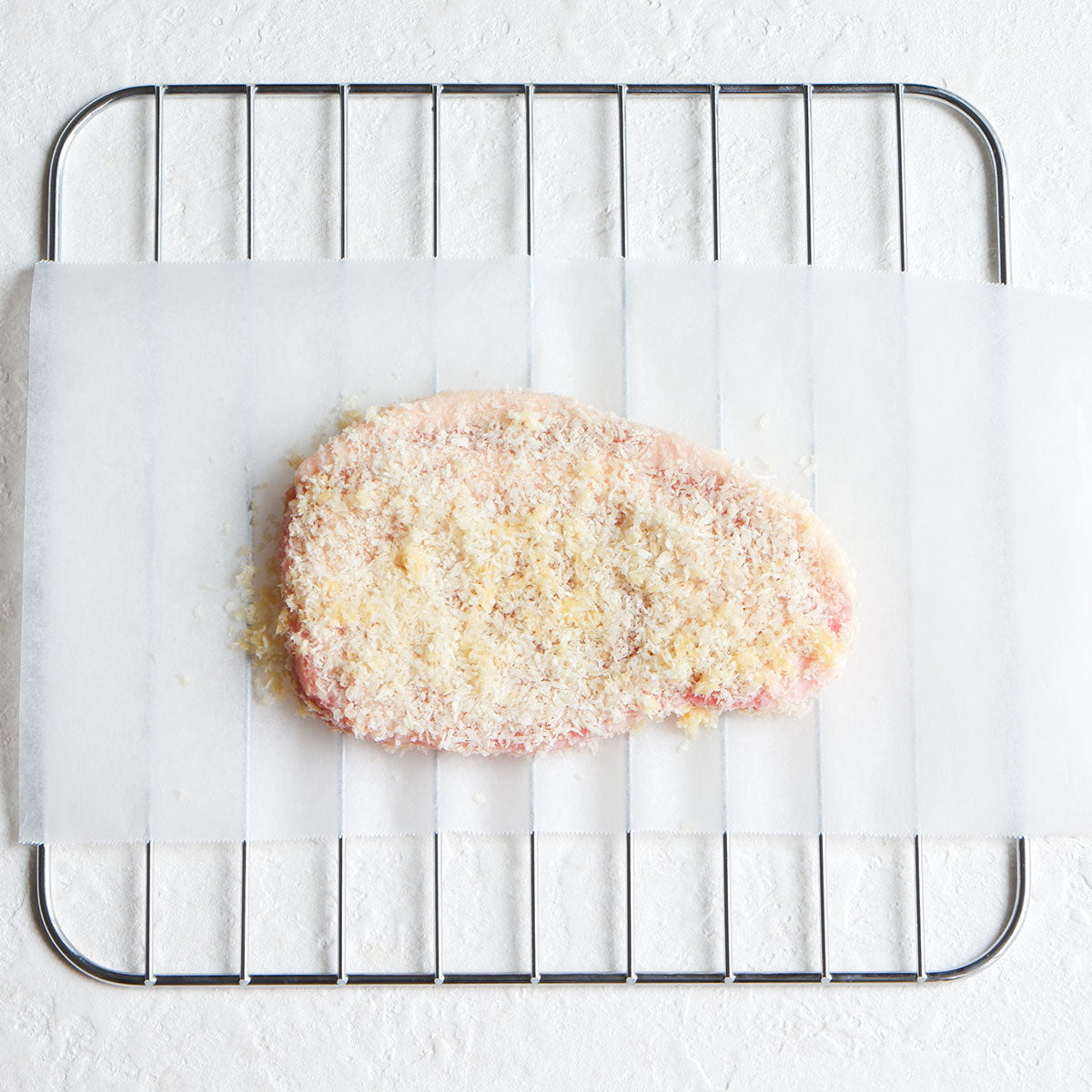 また、油で揚げたときのような仕上がりに近づけるために、油をよく混ぜ合わせたパン粉をフライパンなどで全体がきつね色になるまで炒ってあげると、より油で揚げたときのような仕上がりに近づきます。(Chef活用温度・時間:180℃/10分目安)