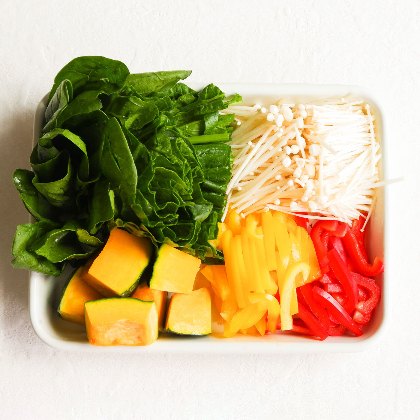 今回のメニューを作る場合、通常かぼちゃを煮る鍋、ほうれん草を茹でる鍋、きのことパプリカを茹でる鍋とたくさんの調理器具と時間が必要です。Chefならすべて同時に加熱でき、調理している間にほかの作業ができます。