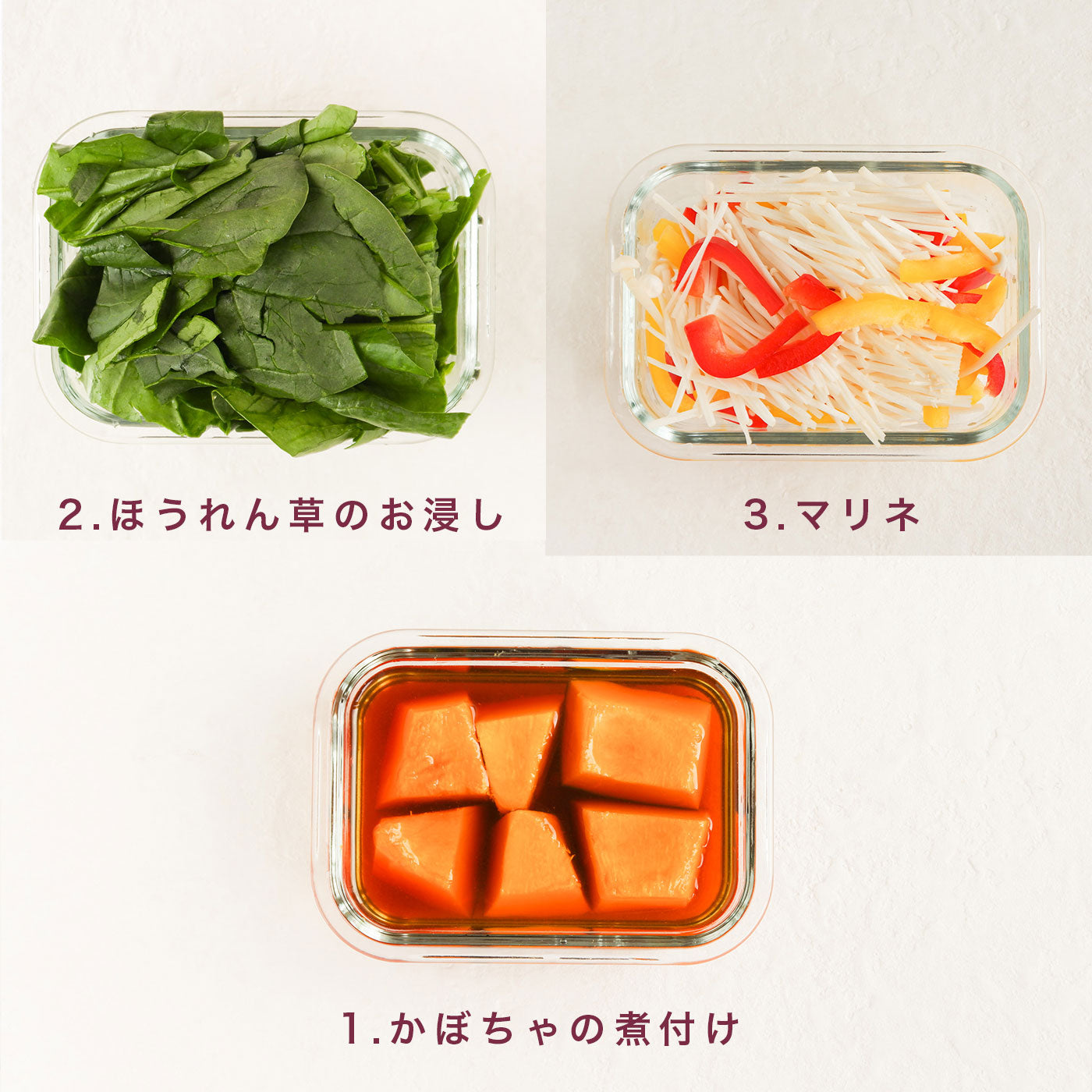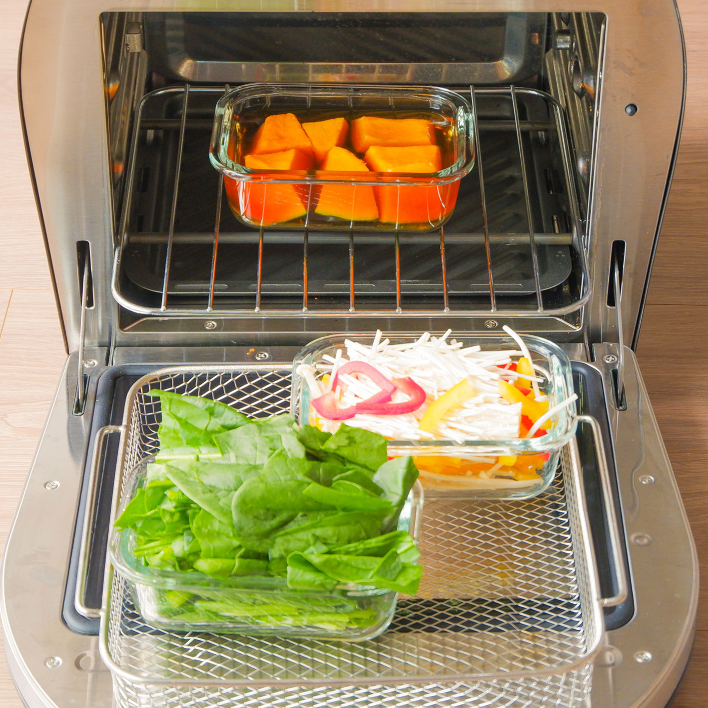 オーブン調理可能の保存容器で調理すれば、そのまま冷蔵庫で保存でき洗い物も減らせます。写真では370mlの保存容器を使用しています。最大4品まで調理可能です。