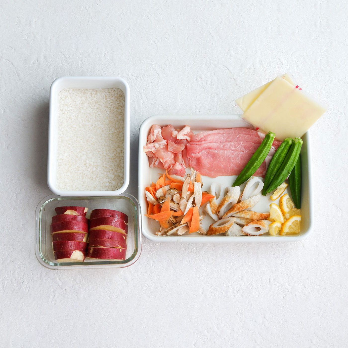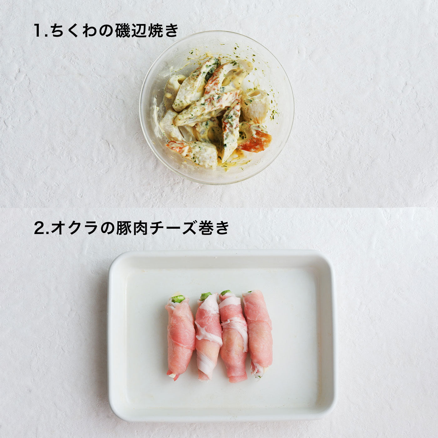 通常同じメニューを作る場合、炊き込みご飯を炊く炊飯器、オクラの豚肉チーズ焼きを焼くフライパン、ちくわの磯辺焼きを作るトースター、さつまいものレモン煮を作る鍋とたくさんの調理機器が必要です。Chefなら一度に4メニューを調理できるので、時短になるだけでなく、洗い物も少なく済みます。加熱している間はごはんや飲み物を用意したりと別の準備ができますよ。