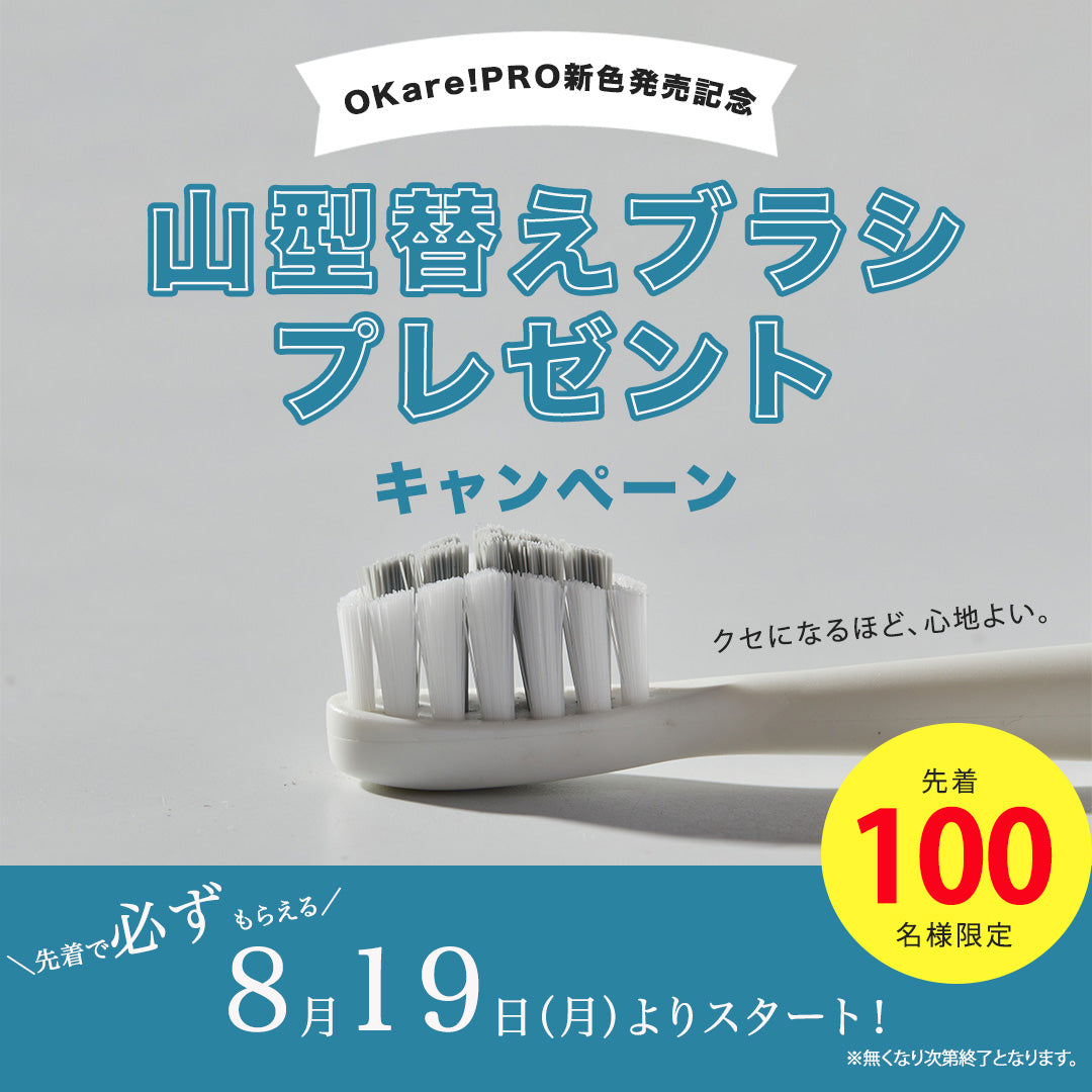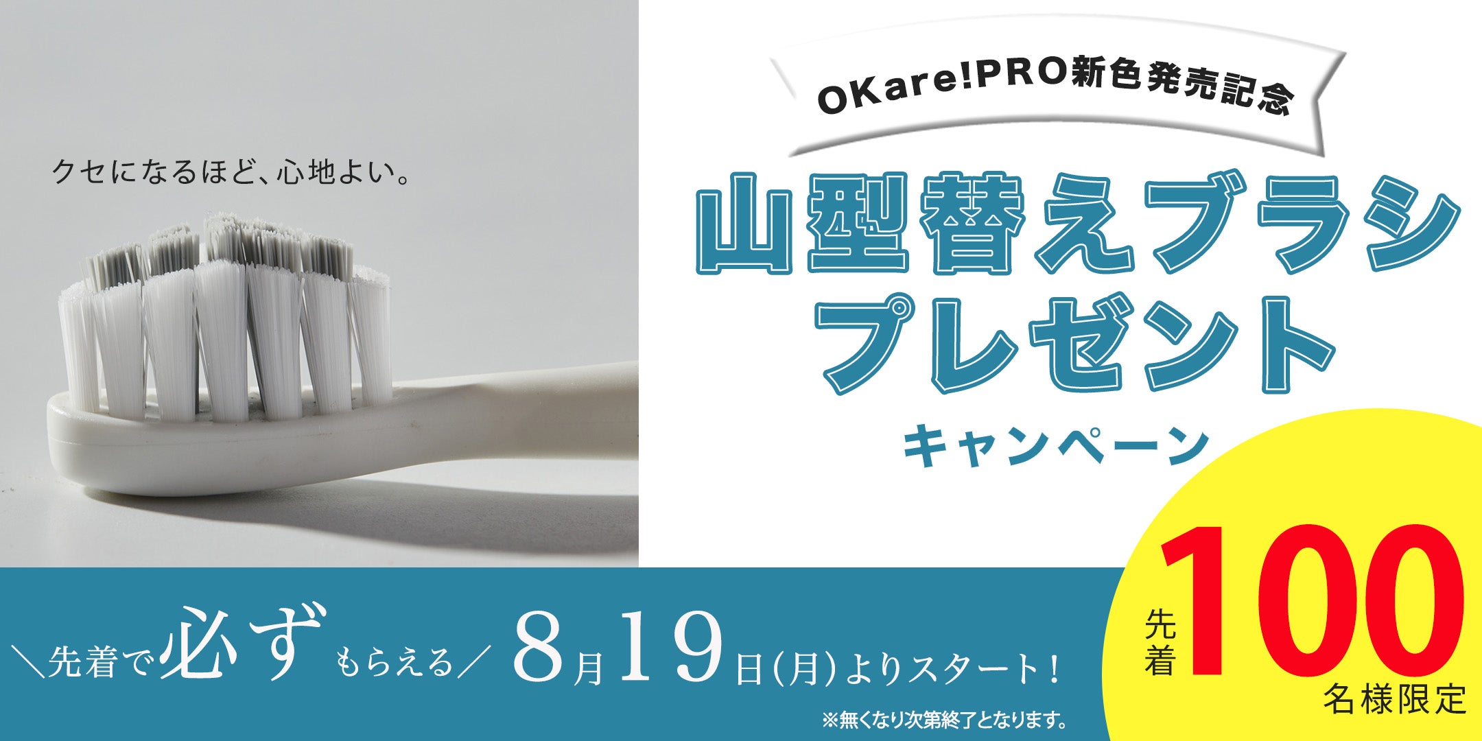 対象期間中に正規販売店やダイレクトストアにてEPEIOS Okare! PRO 音波電動歯ブラシ新色2色のどちらかをご購入頂きましたお客様を対象に、EPEIOS OKare!シリーズ専用替えブラシ(山型)1本プレゼントいたします。
