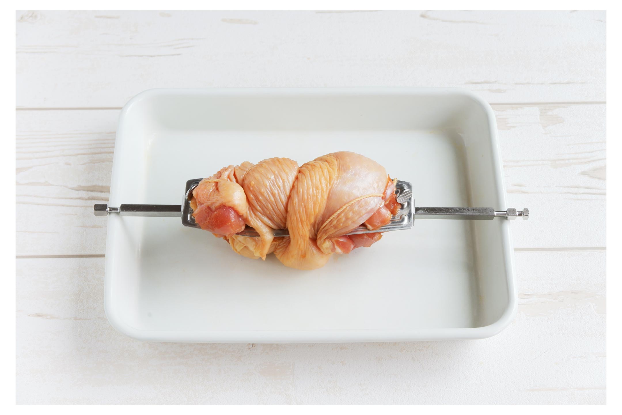 汁気を切った鶏肉をロティサリーフォークに差し込んで固定する。