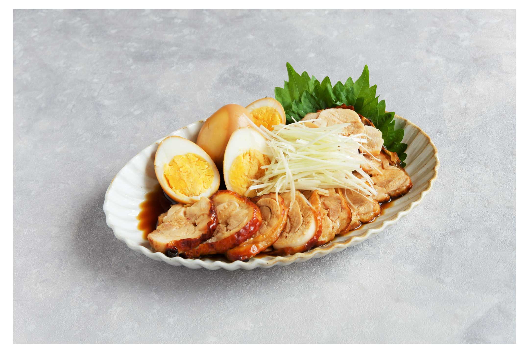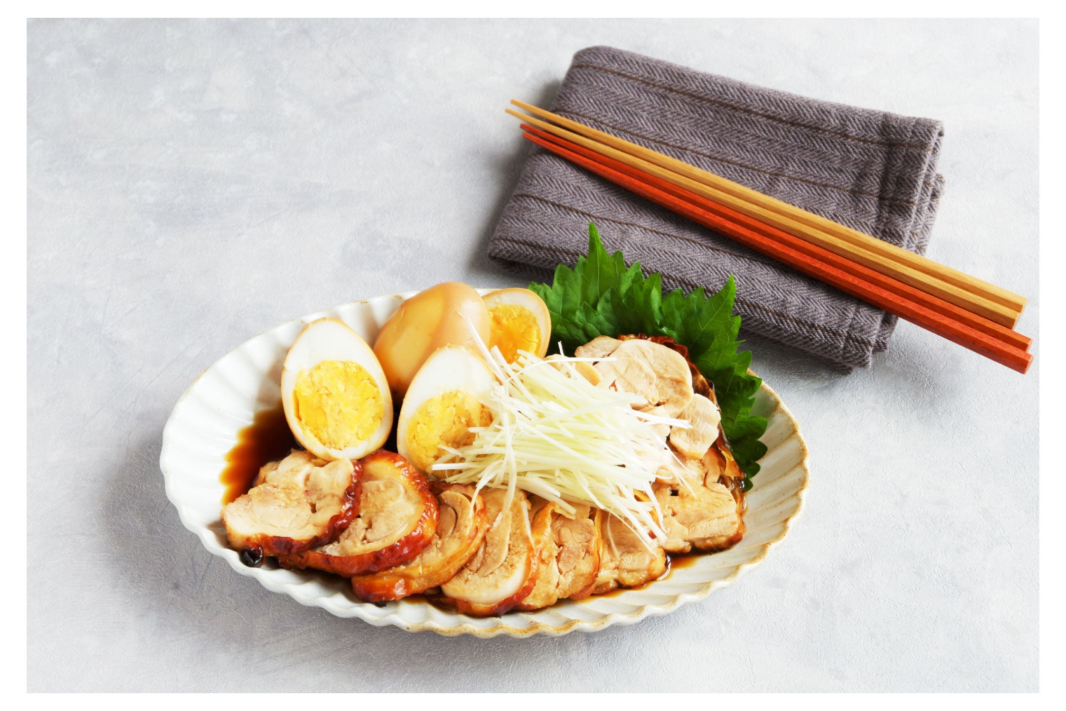 ・ゆで卵を入れる耐熱容器は、回転する鶏肉に当たらないよう浅めのものがおすすめです。途中で一度ゆで卵を返すと、全面に味が染み込みます。