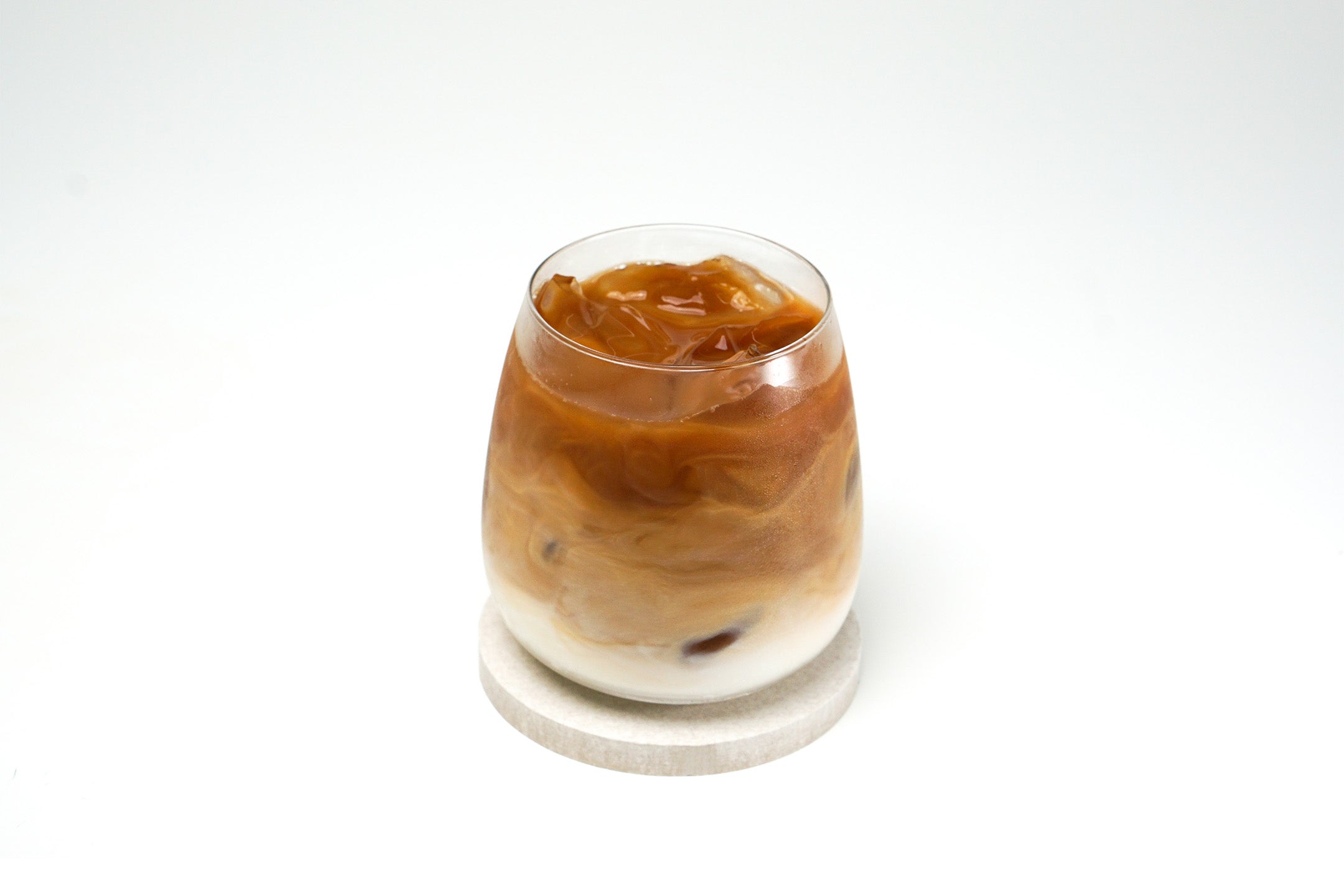 ②氷を入れたグラスに牛乳とコーヒーを注ぐ。