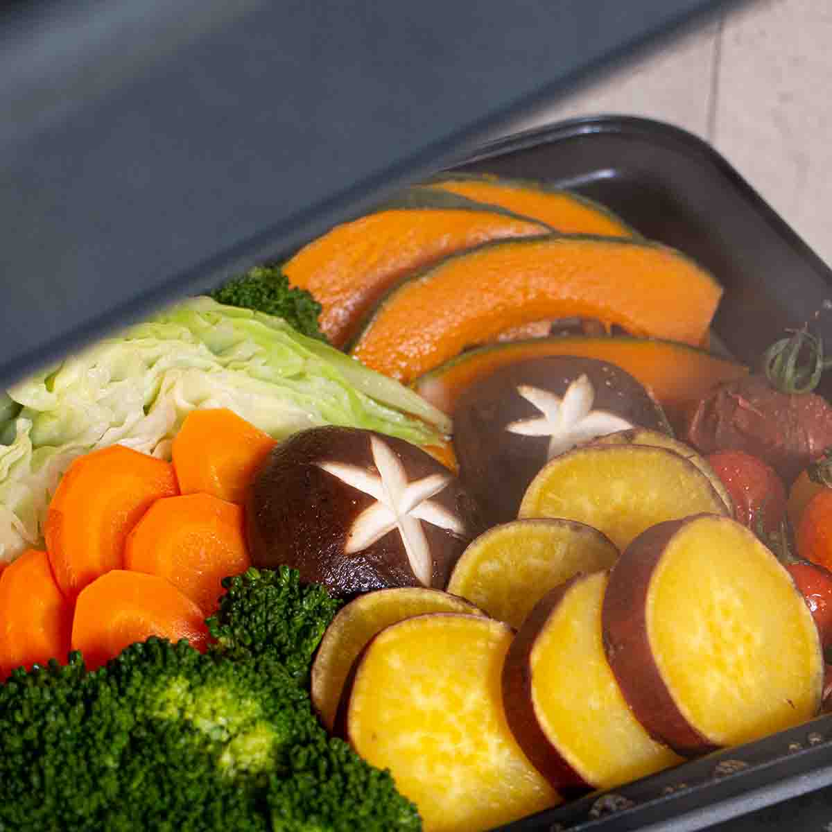 ホットプレートとして焼き料理が出来るのはもちろん、深さのあるプレートで鍋など煮る調理も、さらにたった5秒で出るスチームでヘルシーな蒸し料理もお手のもの。