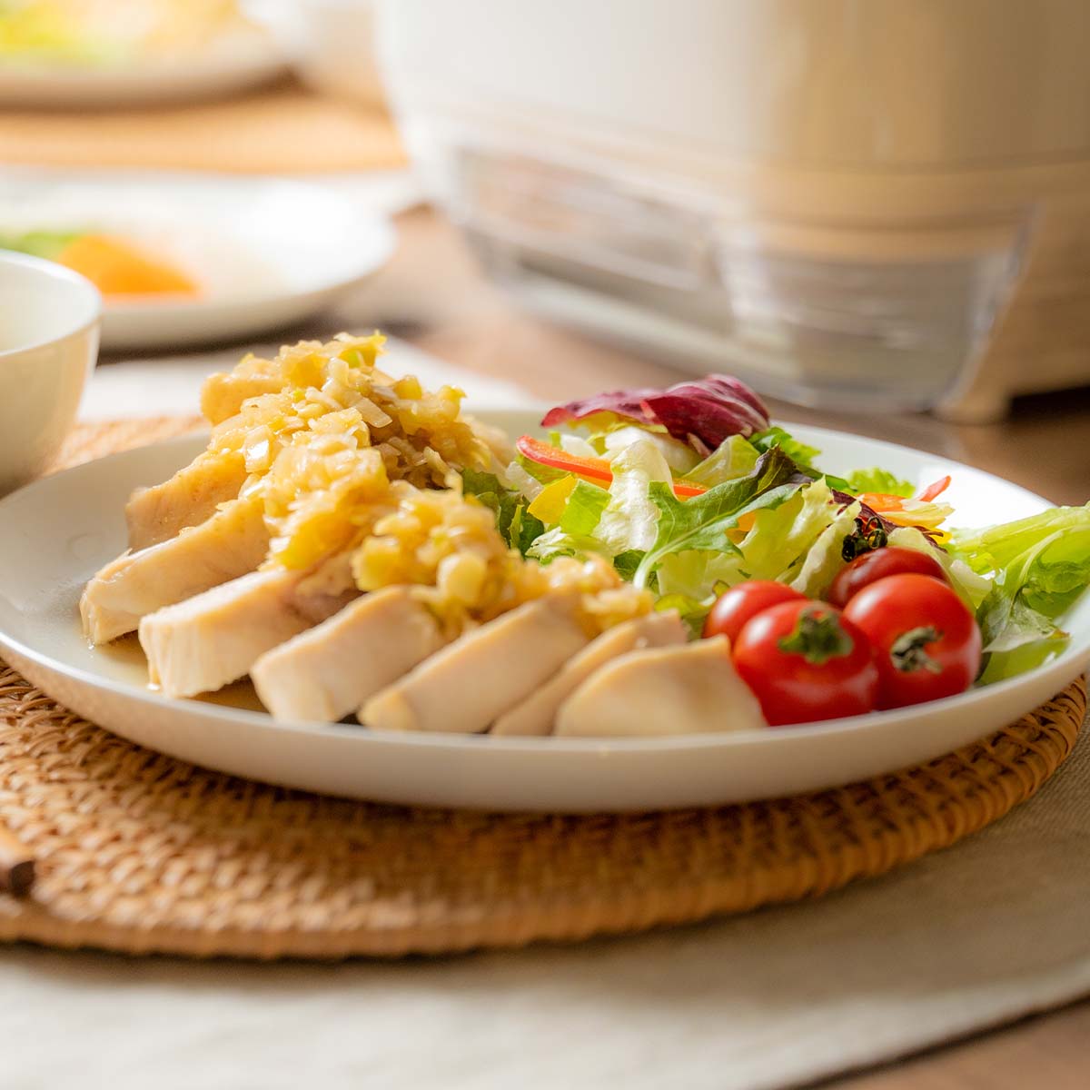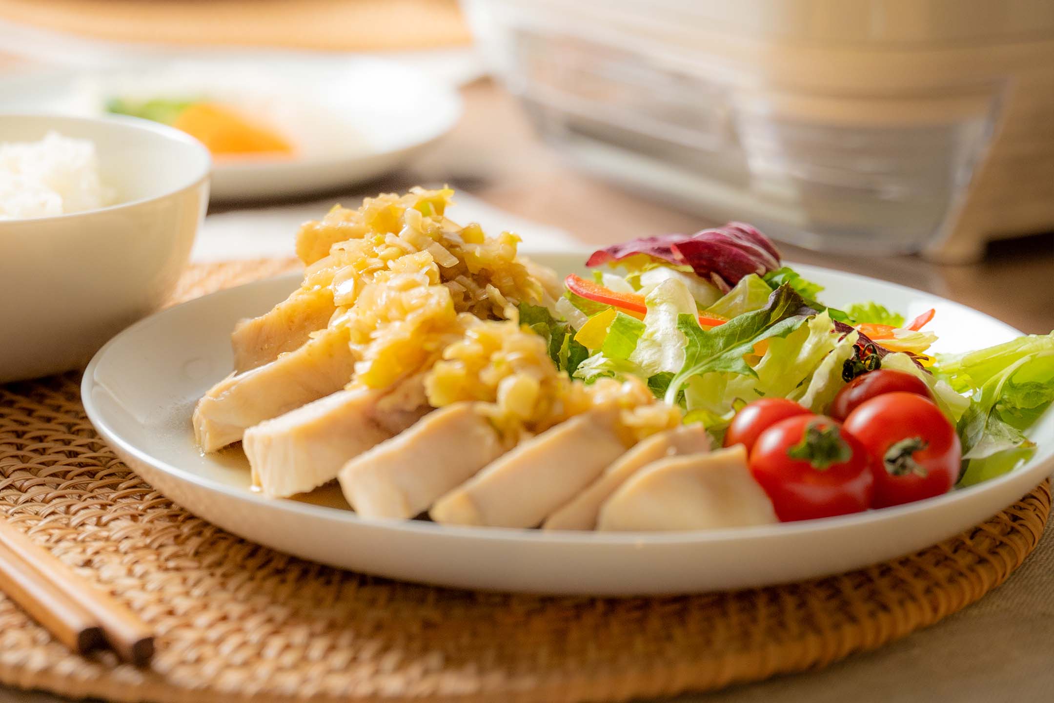 ④むね肉を食べやすい大きさに切りタレをかけて完成。