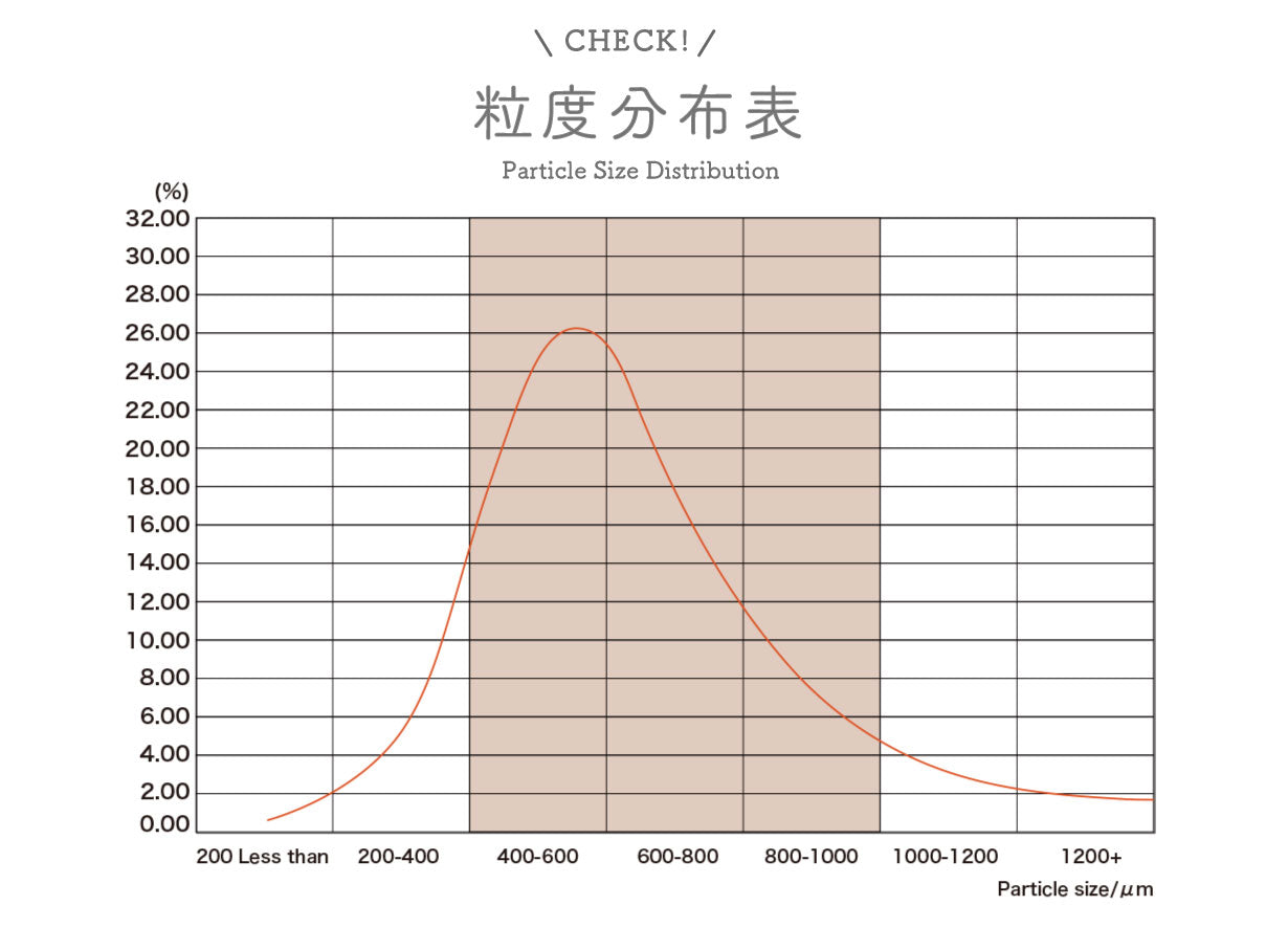 0〜80レベルで微調整ができ、150 ~ 1400umの極限まで均一性のとれた安定した粒度を実現。