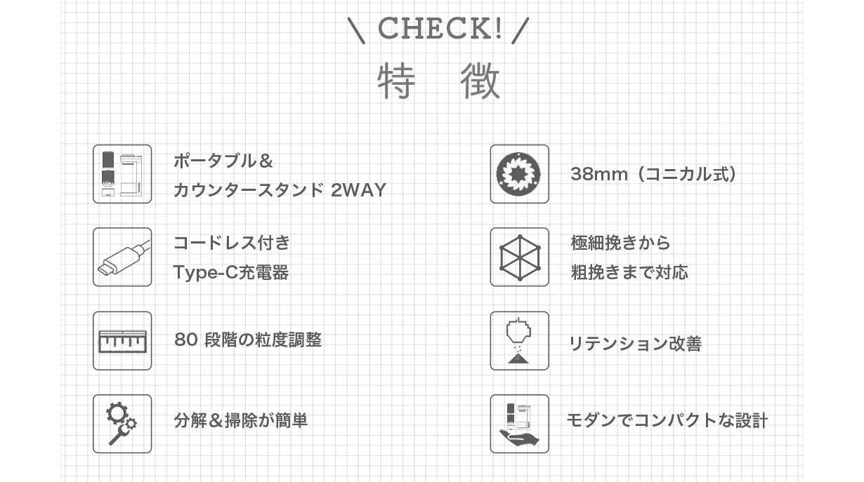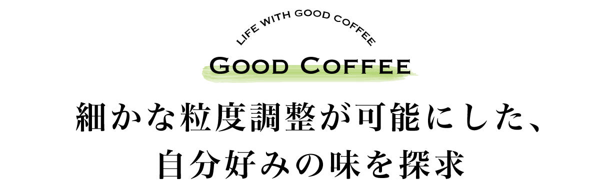挽きたての粉で淹れたコーヒーは、香りも味も格別で至福なひと時が味わえます。また、同じ豆でも挽き方によって風味の変わるため、気分やシーンによって幅広い挽き目調整を楽しめるグラインダーは、手軽にコーヒーを楽しみたい人〜コーヒーを堪能したいと思う人まで多くの方に楽しんでいただけます。