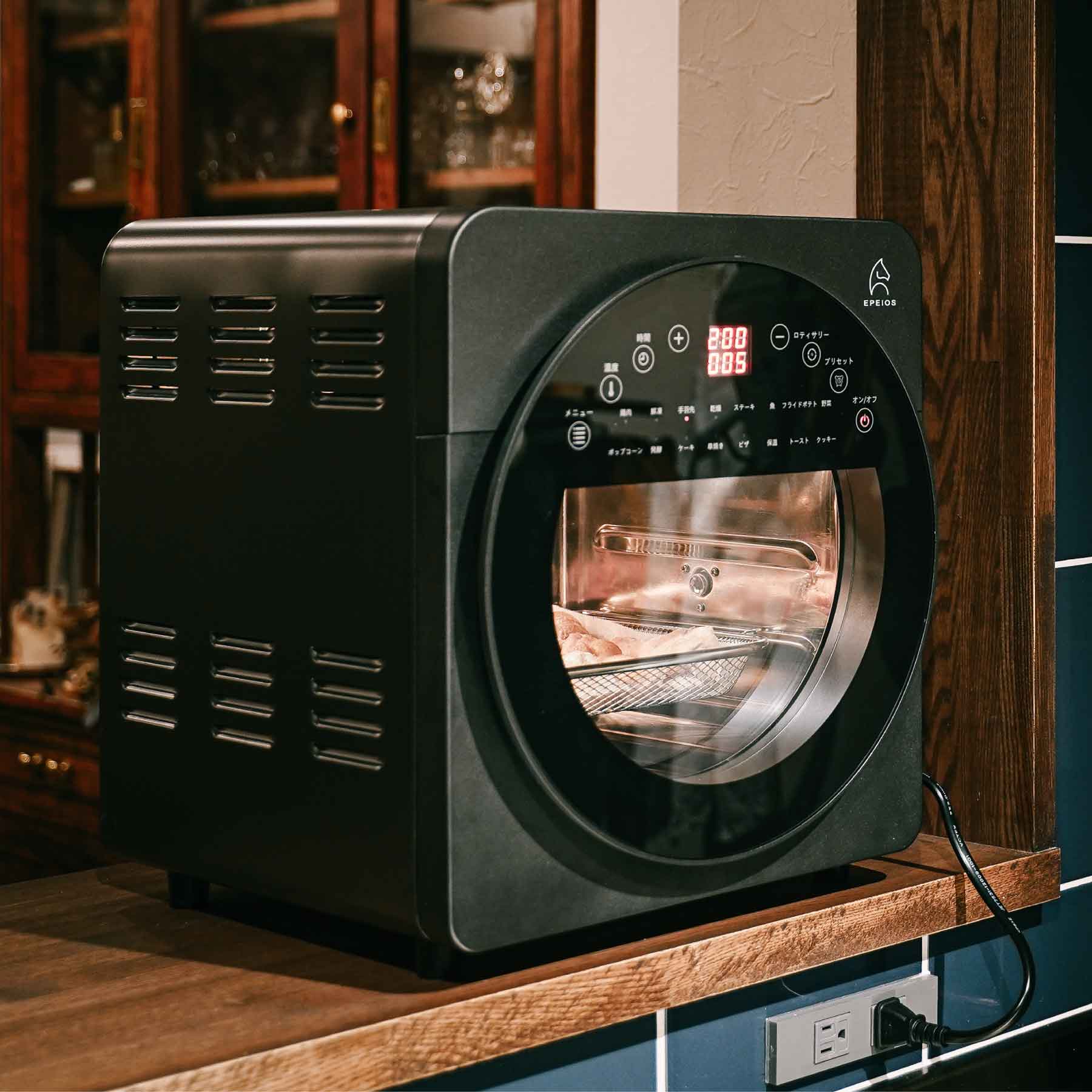 さらに食材を回転させて調理する、ユニークなロティサリーグリル機能も搭載。丸鶏を贅沢に⼀⽻使ったロティサリーチキンや、付属の回転バスケットを使えばお⼦様が喜ぶフライドポテト、ポップコーンなども⼤⼈数⽤に⼀気に調理することもこの⼀台で全て実現いたします。