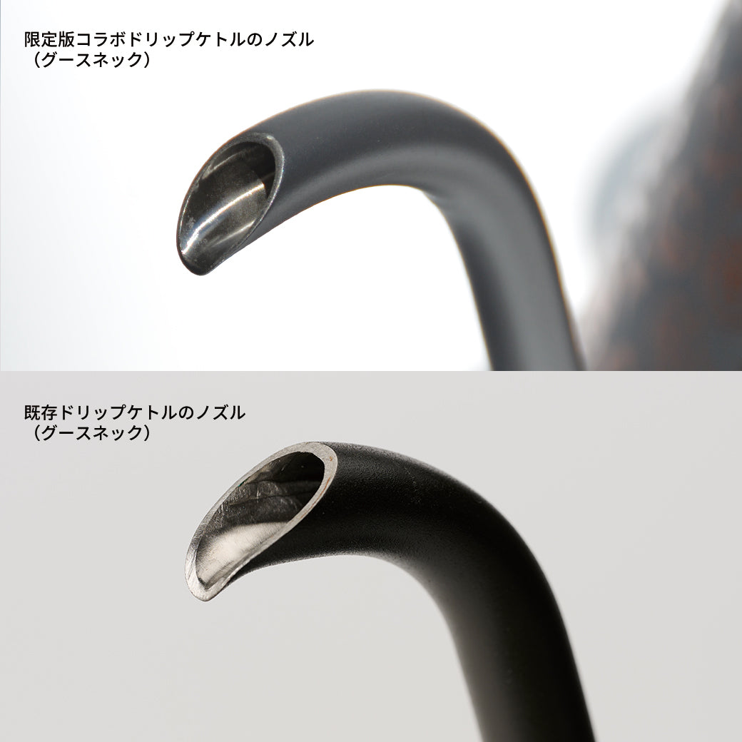 先端のノズルがこれまでより前に延長。グースネック部分のアップ写真(上部:コラボケトル/下部:既存ケトル)