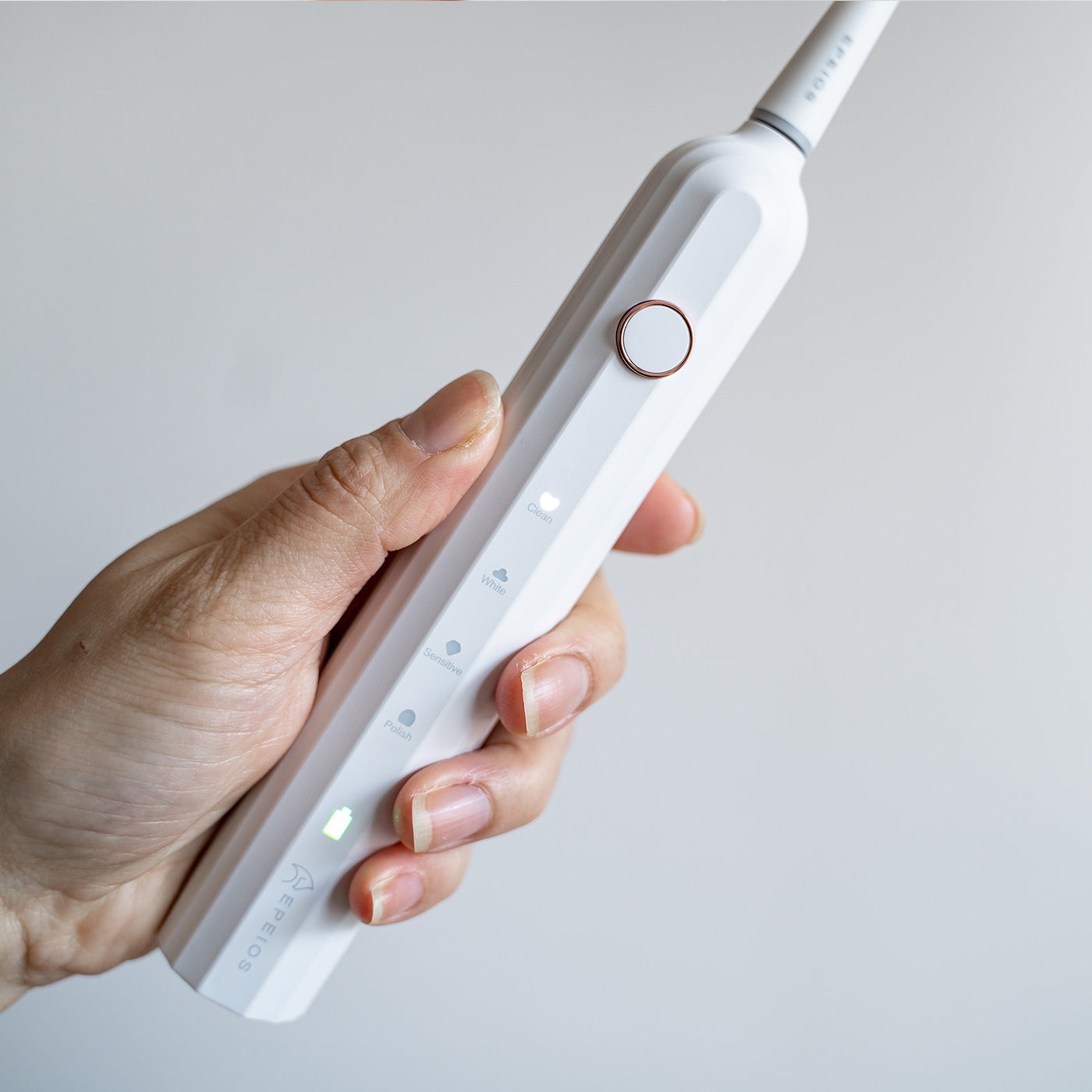 EPEIOSの電動歯ブラシは、手動の歯ブラシと比較して、より効率的に歯垢や汚れにアプローチし、まるで歯医者さんでクリーニングをうけた後のようなツルツル感を実感いただける機能性とデザイン性を兼ね備えました。