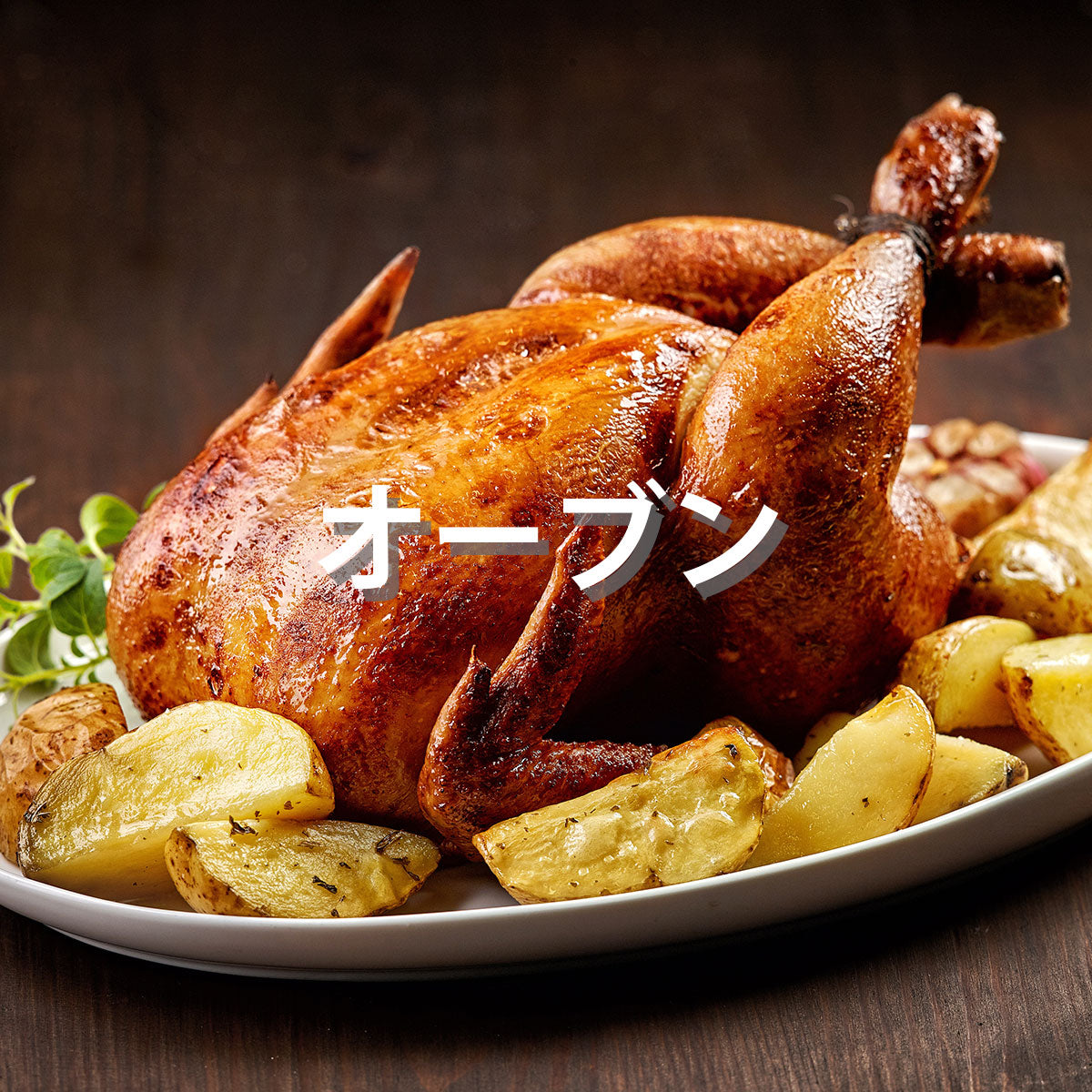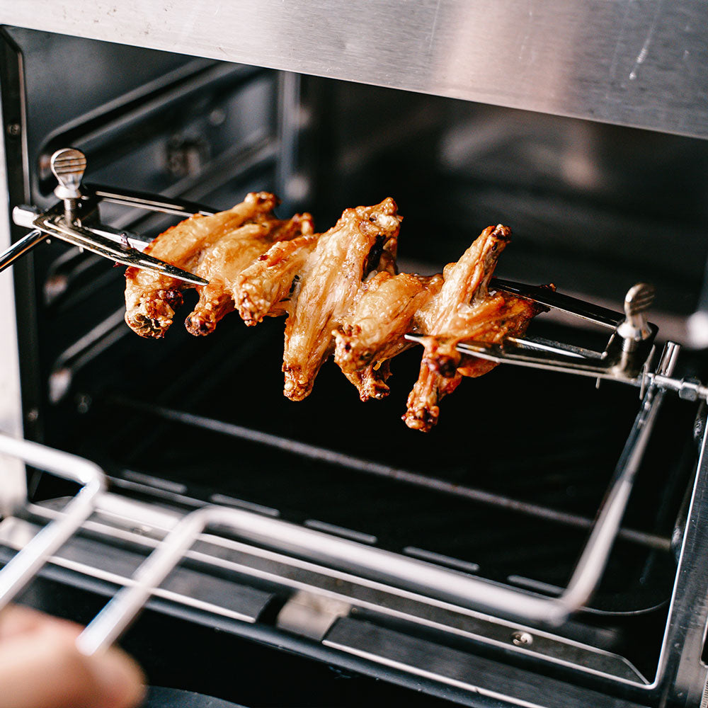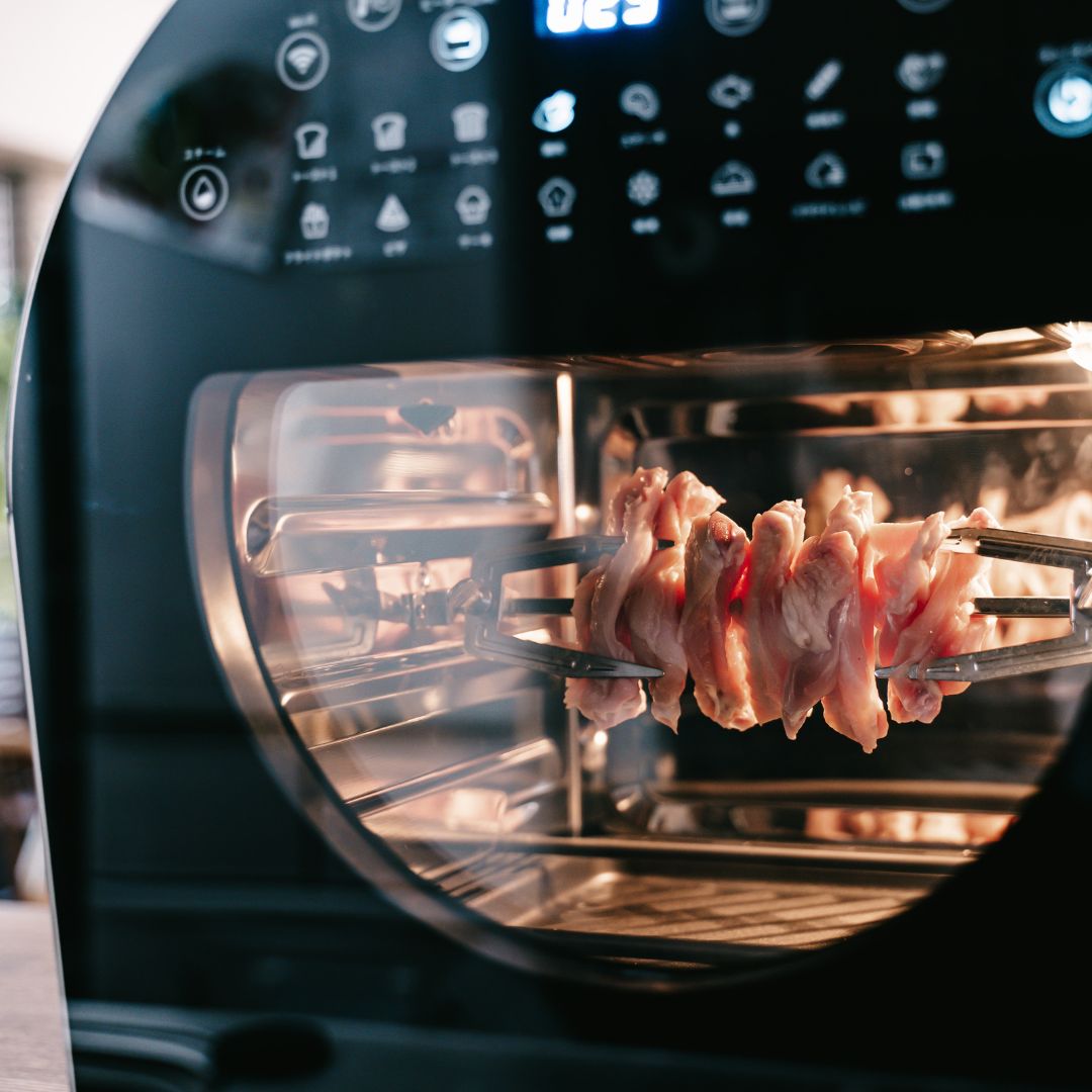 食材を回しながら満遍なく焼き上げるロティサリー機能で、丸鶏まるまるロティサリー調理やポップコーン・冷凍ポテトの調理にも。