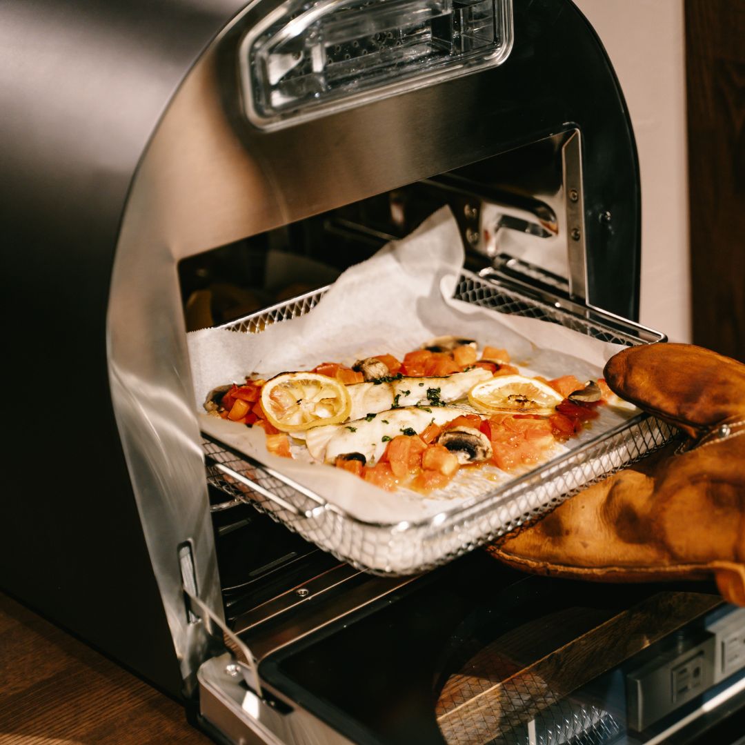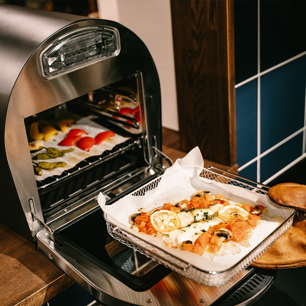 スマートノンフライオーブン "Chef" は本格的な性能と多彩な機能で、毎日の時短調理も特別な日の本格調理も何でもお任せな料理の頼れる相棒です。