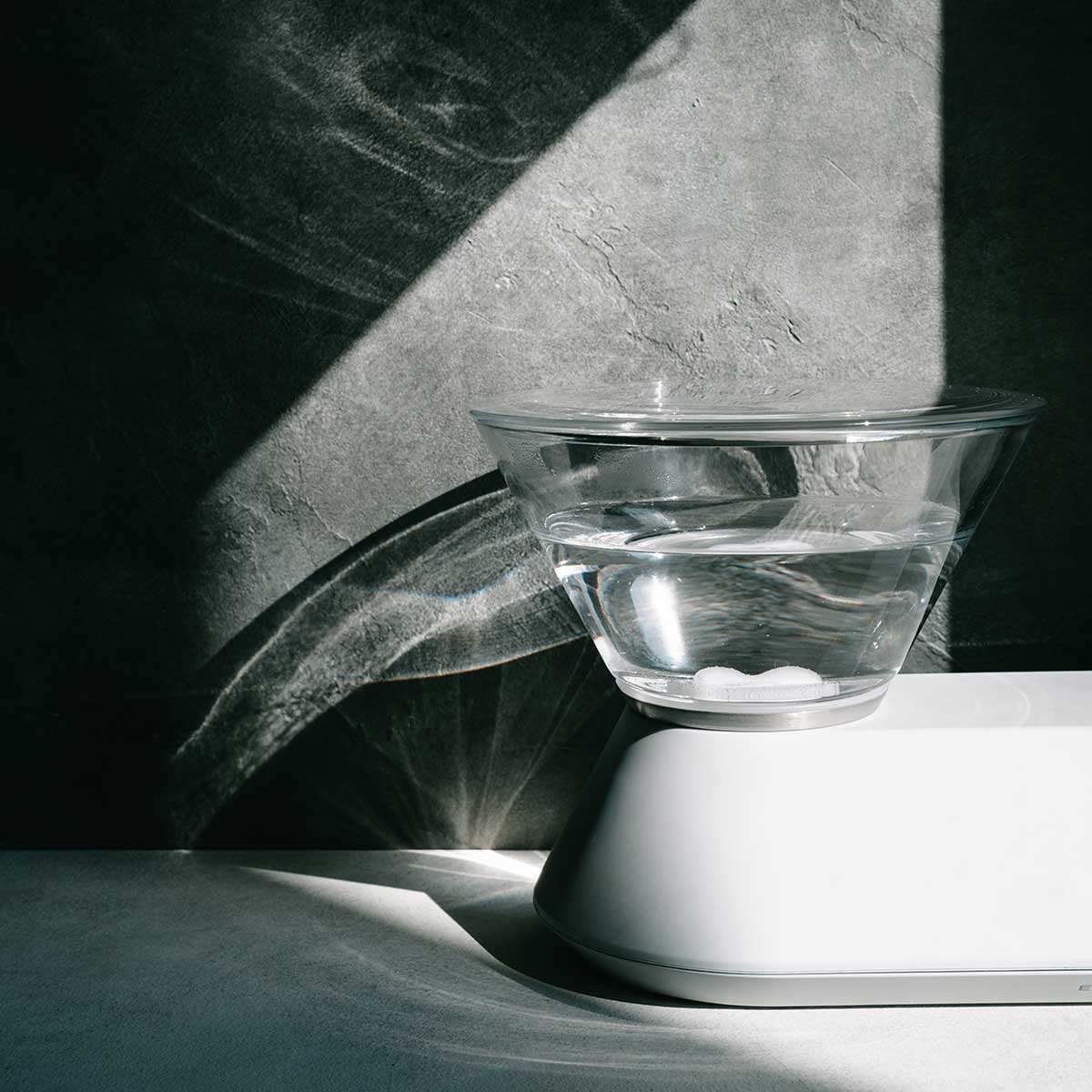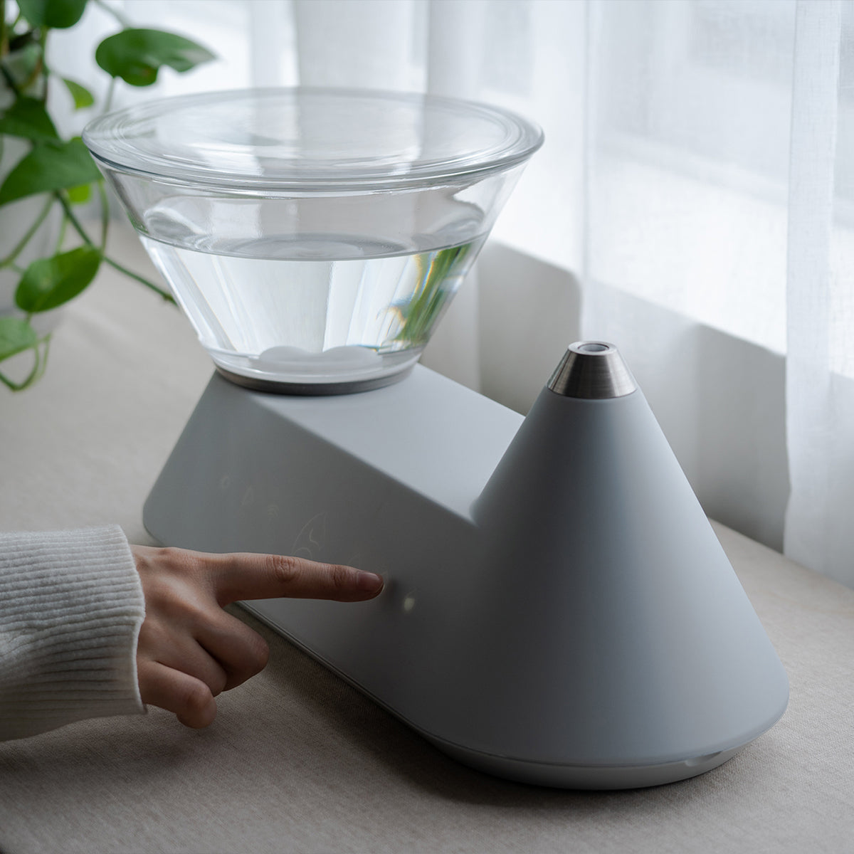 特徴的なガラスタンクは取り外して水洗いできるから、いつでも衛生的。「自然の中にある変化」をもたらす"時の流れ"に着想を得て”砂時計”をモチーフにしており、水を注いだ時に水と光が織りなす美しさとデザイン性を追求。