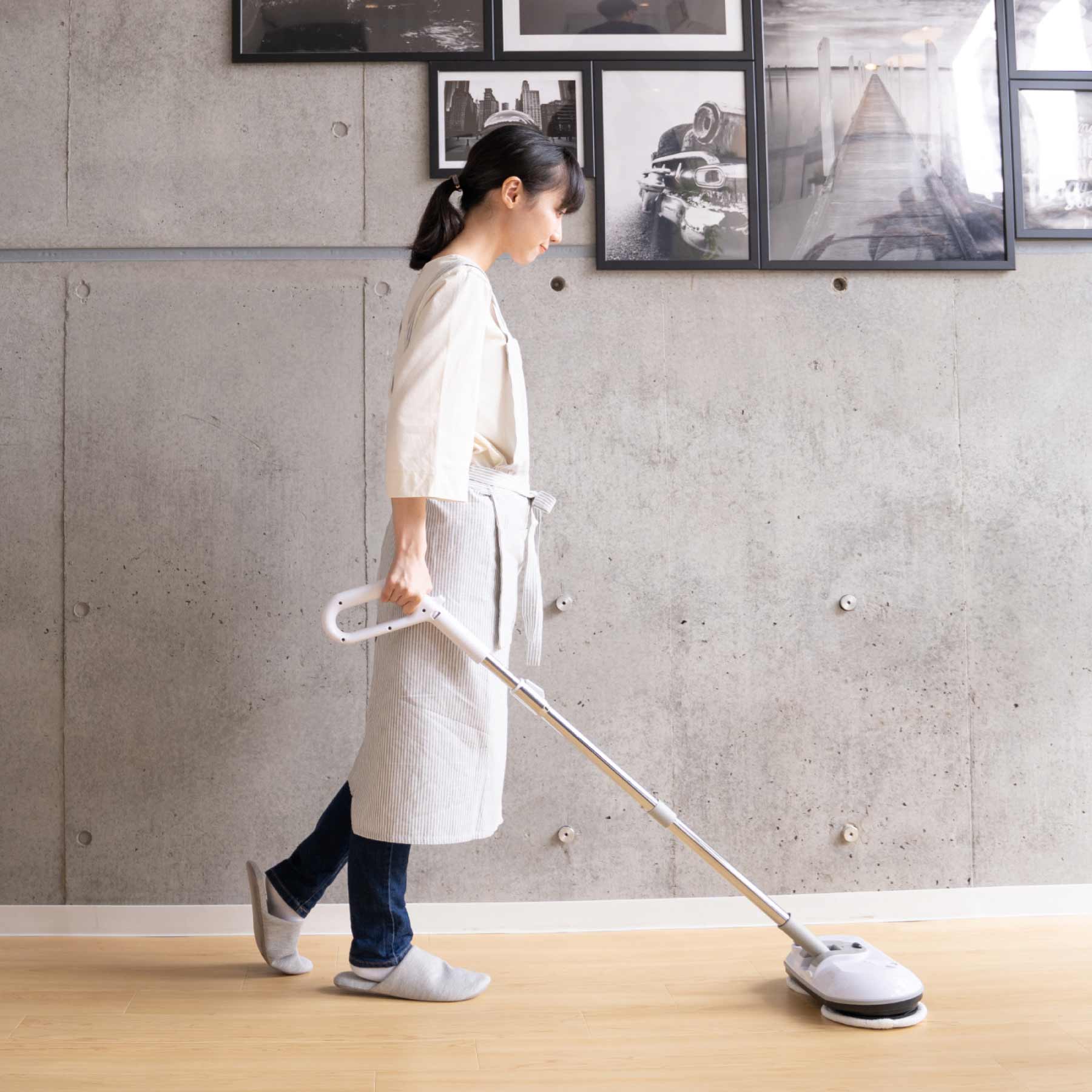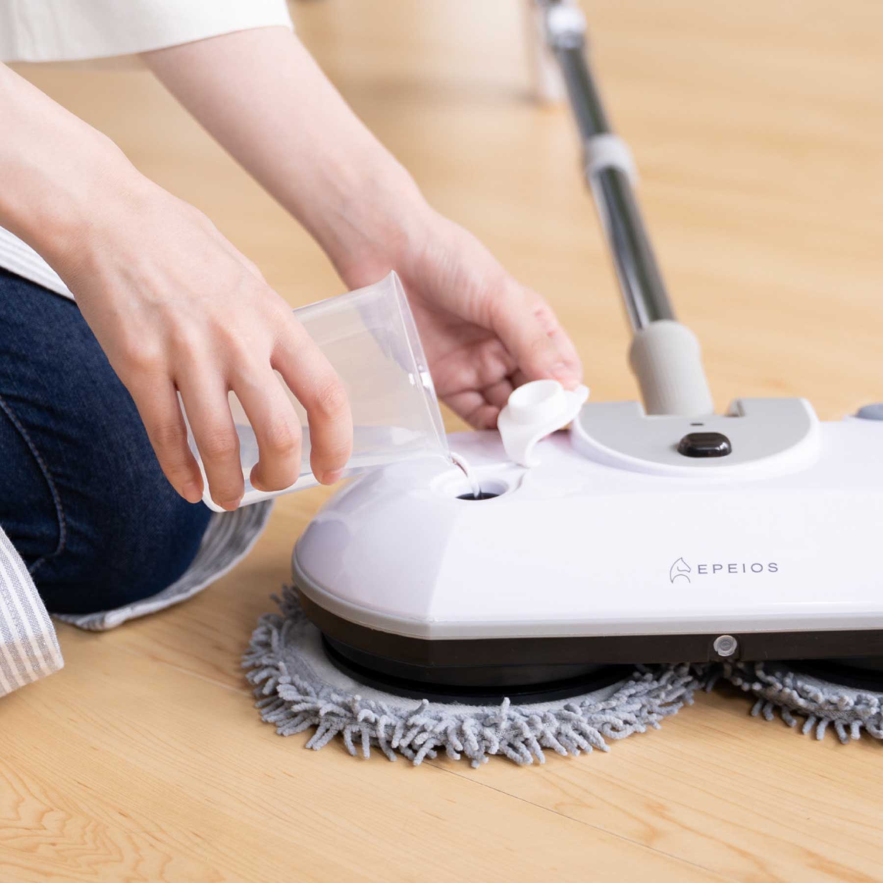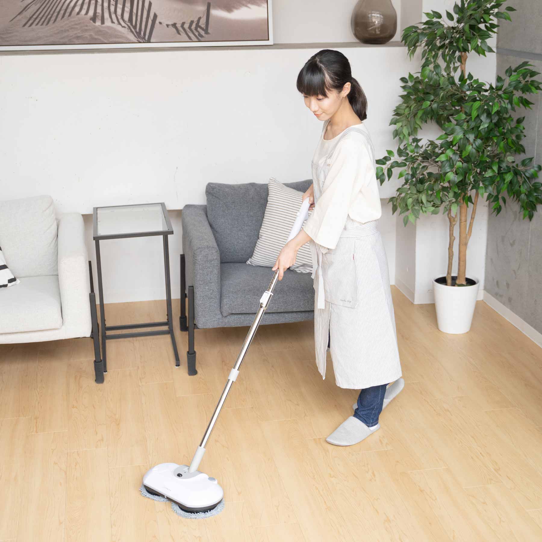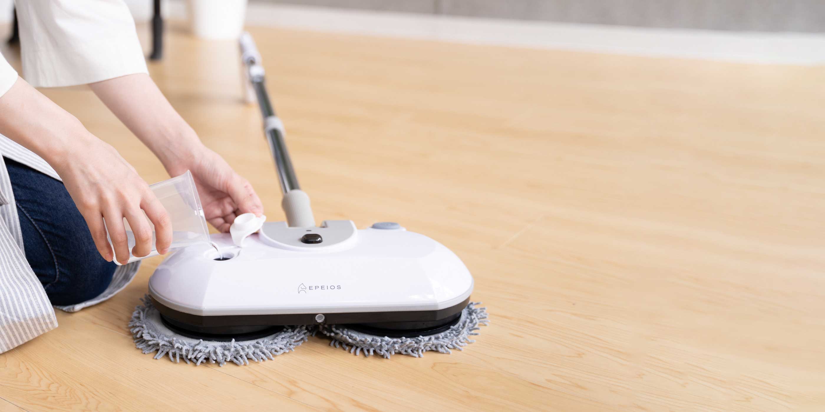 EPEIOS の電動モップはスタンド型の回転モップで、床のから拭きから水拭きまで、立ったままで行える便利なモップ。