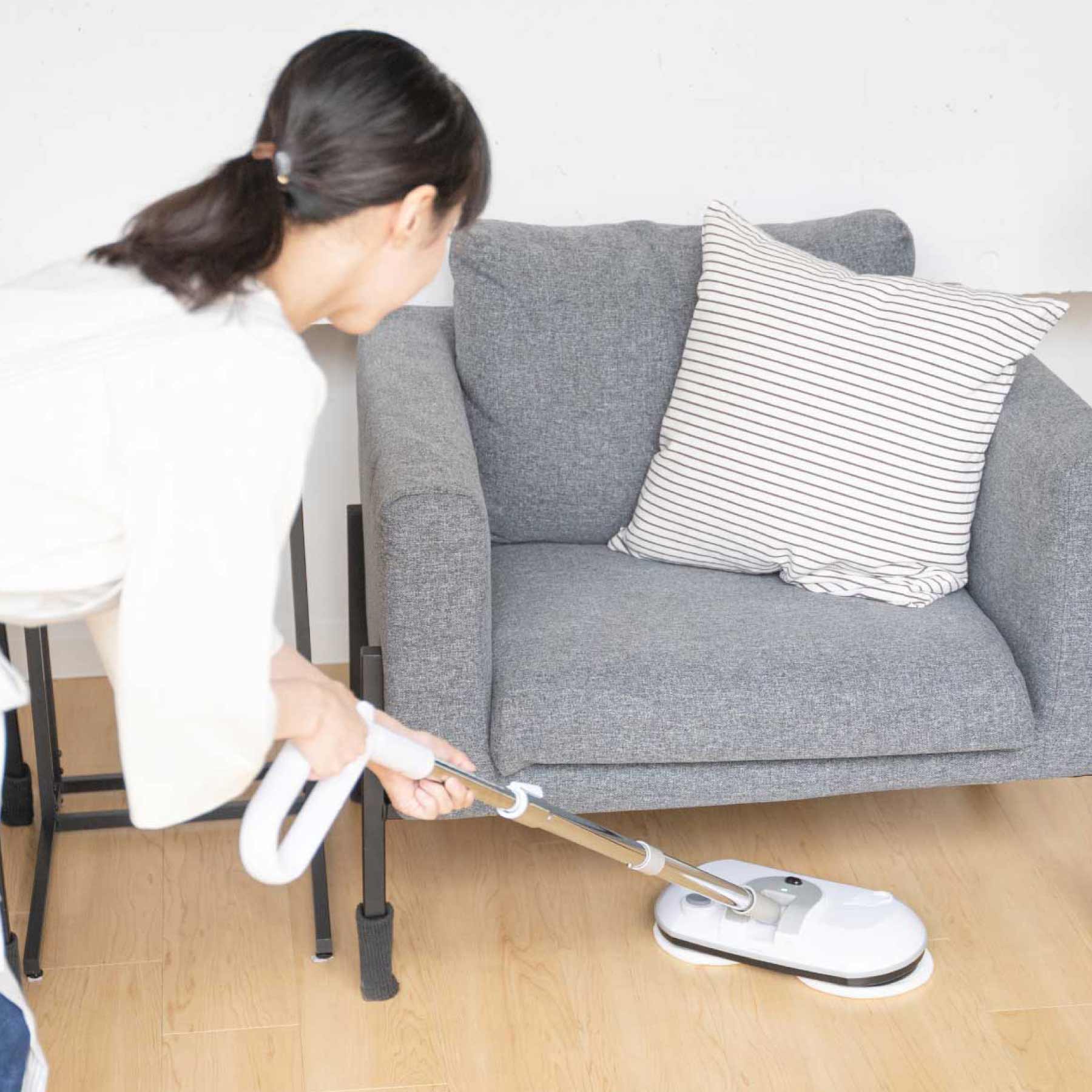 いままでの雑⼱掛けや⼿動のフロアモップではゴシゴシこすらないと落ちなかった汚れも、立ったままで楽々お掃除。