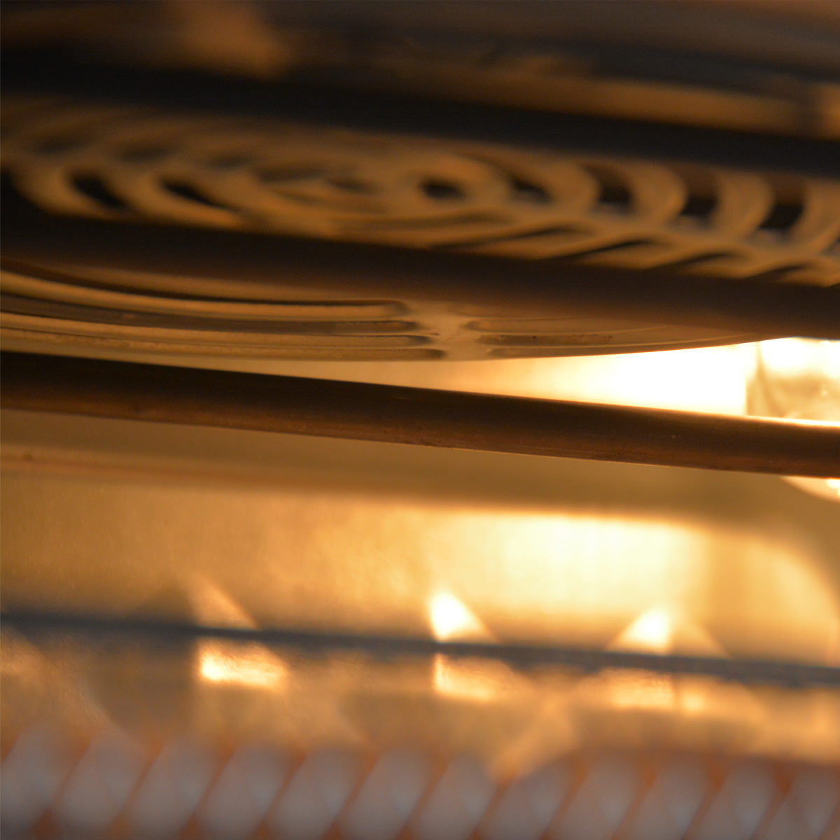 下ヒーターにファンを搭載したコンベクションオーブントースター。上下のヒーターによってあたためられた空気を循環させ食材を焼き上げるので、焼きムラなく仕上がります。