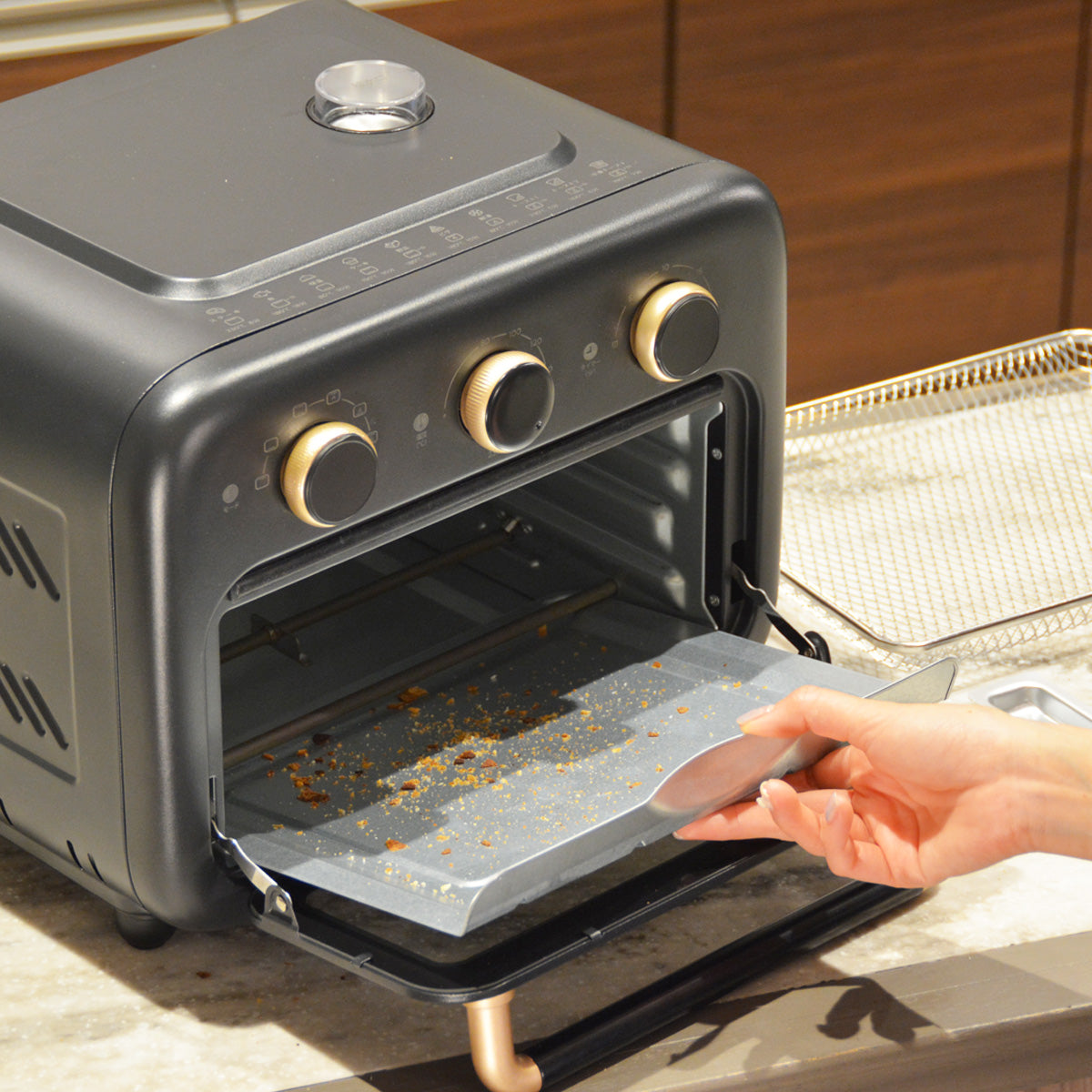 内で落ちたパンくずや油をキャッチする油・くず受け皿、メッシュバスケット、トレー、ホルダー、水受け皿は、使用後サッと取り外して丸洗いが可能で、お手入れも簡単です。