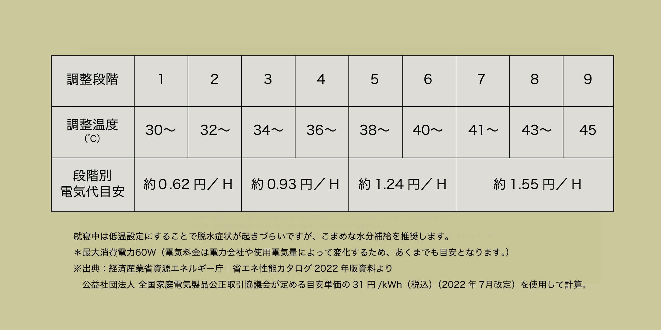 1〜9段階と細かく温度調整でき、最⻑12時間連続使⽤すると自然にOFFになる安⼼機能付きにしたことで、低温設定にして朝まで安心して就寝いただけます。